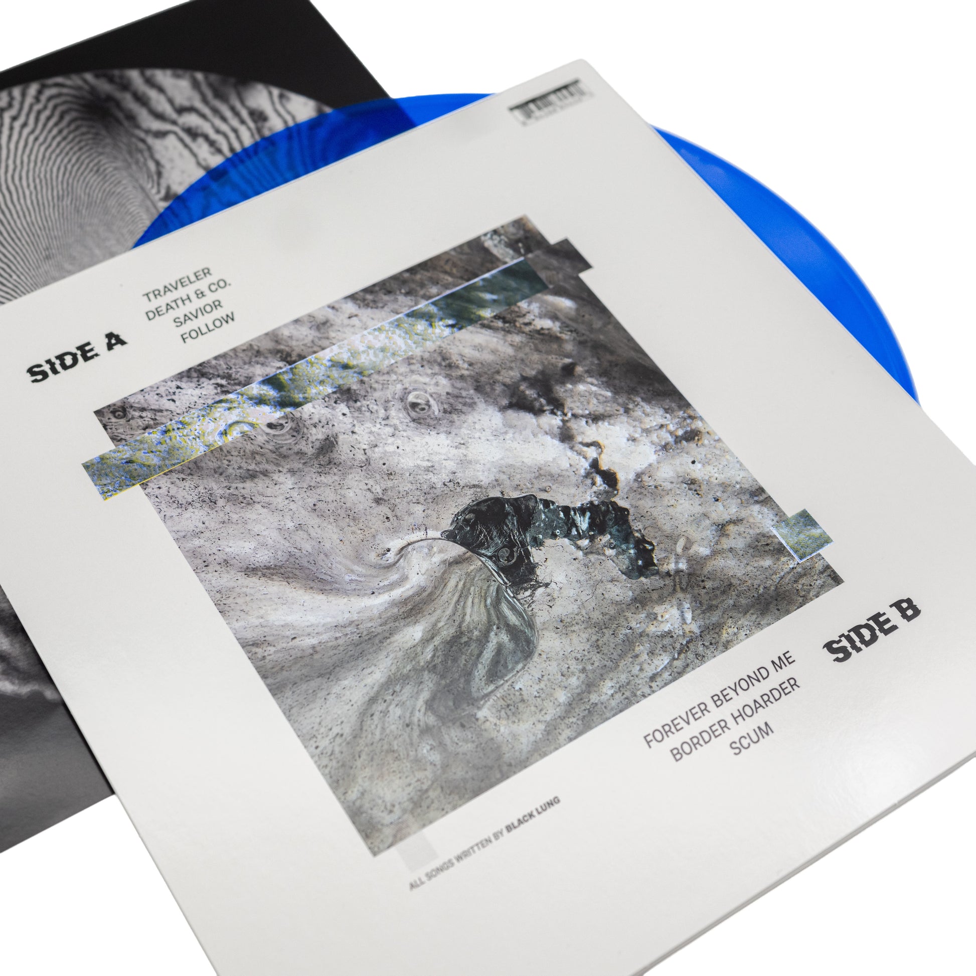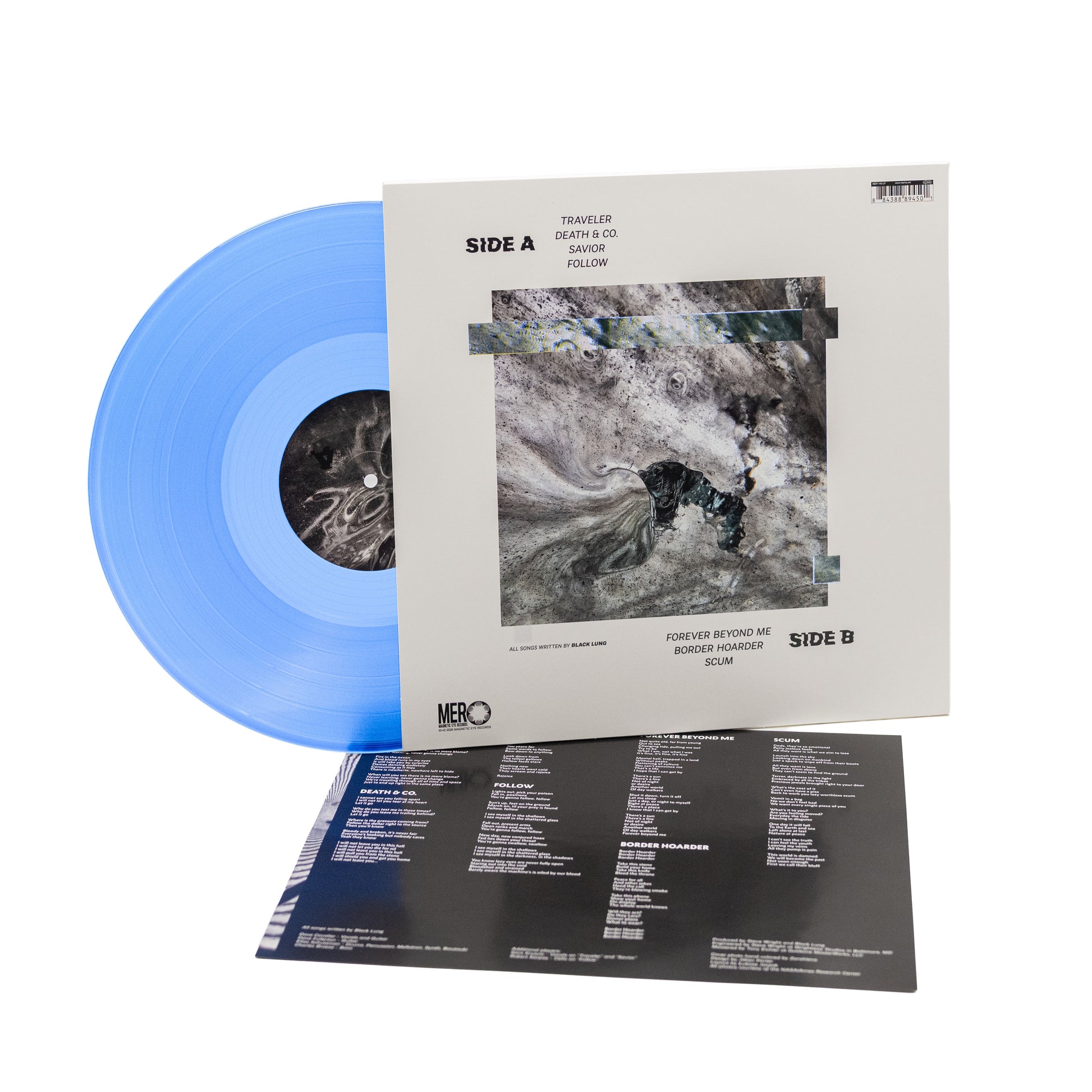 Single pocket LP on transparent vinyl with light blue and black splatter + printed lyric insert and poly-lined inner sleeve